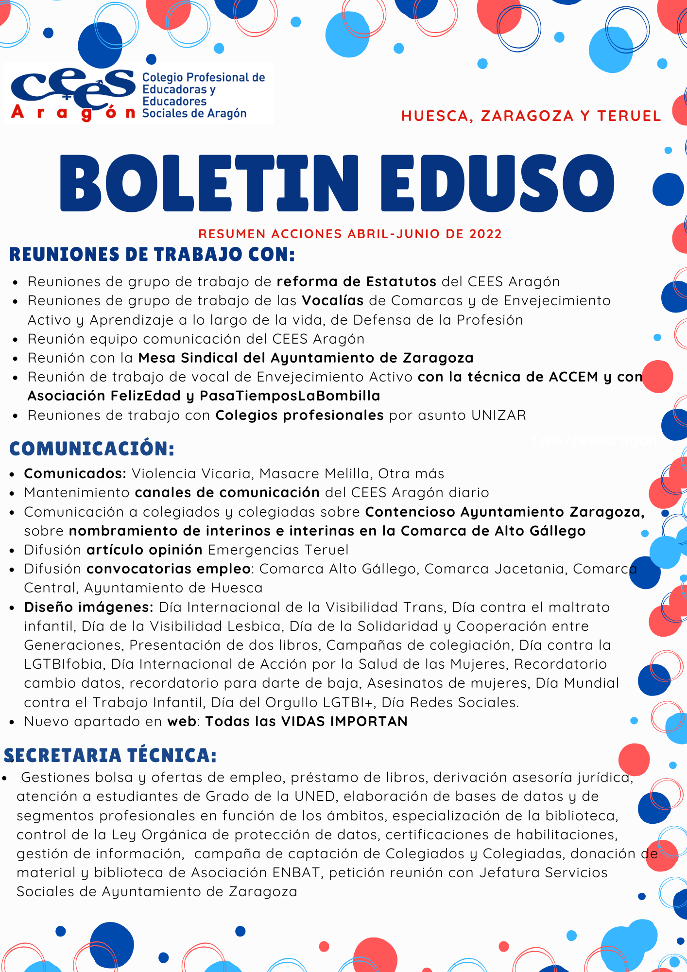 El CEES-ARAGÓN no detiene su actividad. Cerraremos una semana a finales de Agosto. Pero mientras... Te informamos de nuestros servicios, foros en los que participamos, actividades de Junta... Aquí tienes nuestro último boletín trimestral.