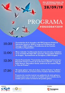 Zaragoza acogerá, el próximo 28 de septiembre, los actos estatales para conmemorar el Día Internacional de la Educación Social bajo el lema Educación Social: profesión y futuro. Si bien el Día Internacional de la Educación Social se conmemora el 2 de octubre, este año lo celebraremos presencialmente el 28 de septiembre en Zaragoza, en el Centro de Historias -sito en plaza de San Agustin nº 2-, difundiendo y potenciando #Edusoday2019.