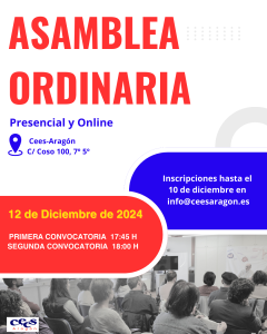 Por CEES Aragón|viernes, 8 de noviembre 2024|Sin categoría| ¡Comparte esta entrada! Elige la plataforma -> FacebookXLinkedInTumblrPinterestCorreo electrónico Artículos relacionados Galería DICIEMBRE NEGRO jueves, 11 de diciembre 2025 | Sin comentarios Galería Se precisa Educador-a Social para Intervención Familiar en Huesca. martes, 9 de diciembre 2025 | Sin comentarios Galería MICROFORMACIÓN ENERO: Abiertas inscripciones viernes, 5 de diciembre 2025 | Sin comentarios Galería Reunión informativa: Vocalía de género y diversidad jueves, 4 de diciembre 2025 | Sin comentarios Galería PUESTO DE EDUCADOR-A SOCIAL PARA CENTRO DE PROTECCIÓN DE MENORES EN HUESCA jueves, 4 de diciembre 2025 | Sin comentarios Deja tu comentario Cancelar la respuestaComentar Δ