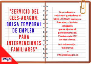 Por CEES Aragón|jueves, 27 de enero 2022|Educación social, Empleo| ¡Comparte esta entrada! Elige la plataforma -> FacebookXLinkedInTumblrPinterestCorreo electrónico Artículos relacionados Galería 2ª SESIÓN FORMATIVA DEL AÑO miércoles, 18 de enero 2023 | Sin comentarios Selección de personal para la Fundación para el apoyo a la autonomía y capacidades de las personas de Aragón martes, 3 de enero 2023 | Sin comentarios Galería OFERTA DE EMPLEO TRES TARDES POR SEMANA CON POSIBILIDAD DE AMPLIAR jueves, 1 de diciembre 2022 | Sin comentarios Galería PUESTO DE COORDINADOR-A DE RED DE ENTIDADES jueves, 24 de noviembre 2022 | Sin comentarios Galería Selección de personal. Nuevas vacantes. miércoles, 16 de noviembre 2022 | Sin comentarios Deja tu comentario Cancelar la respuestaComentar Δ