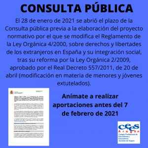 El 28 de enero de 2021 se abrió el plazo de la Consulta pública previa a la elaboración del proyecto normativo por el que se modifica el Reglamento de la Ley Orgánica 4/2000, sobre derechos y libertades de los extranjeros en España y su integración social, tras su reforma por la Ley Orgánica 2/2009, aprobado por el Real Decreto 557/2011, de 20 de abril (modificación en materia de menores y jóvenes extutelados).