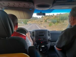 En el acompañamiento a las residencias de Calamocha se incorporaron al operativo otra trabajadora social y el educador social comarcales, que en los vehículos adaptados de Cruz Roja Teruel realizaban funciones de apoyo emocional y psicosocial, al igual que dentro del pabellón municipal y en su alojamiento provisional.