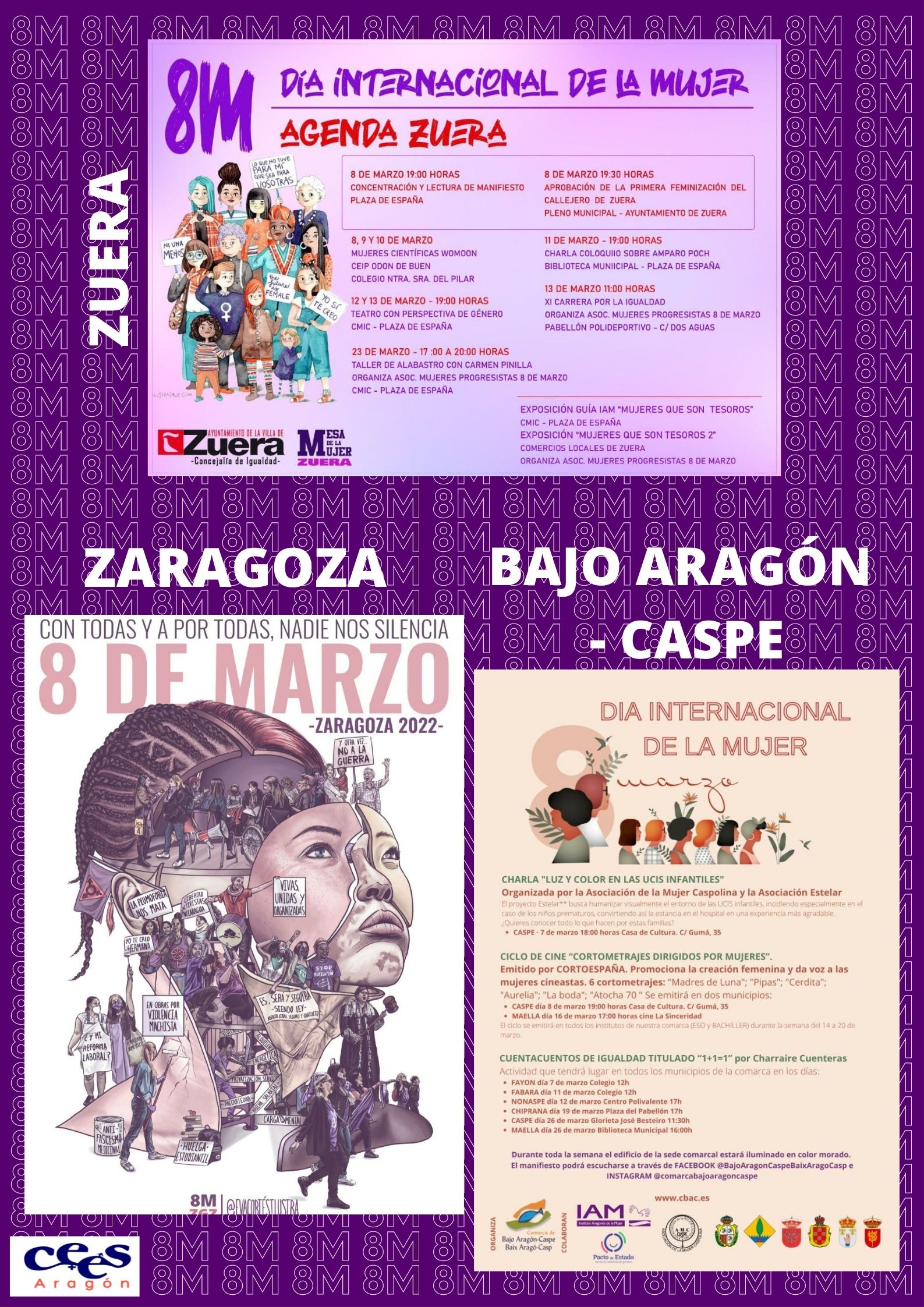 8M Zuera: https://www.facebook.com/Mujeres-Progresistas-Ocho-de-Marzo 8M Bajo Aragón - Caspe: https://www.cbac.es/8-de-marzo-dia-internacional-de-la-mujer/ 8M Zaragoza: https://www.facebook.com/8mzgz/